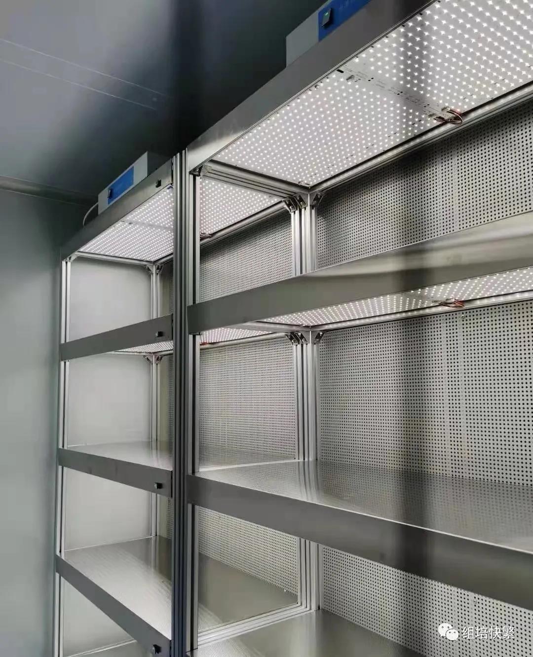 采用歐標鋁型材作為整體框架主材料,立柱規格:40×40*2mm,表麵電泳處理。耐腐蝕。表麵光潔度高,無毛刺,無需二次加工。每層置物板下方配備LED植物專用生長光源,使用壽命長,節能,光照均勻性好。置物板配備鏡麵不鏽鋼,耐腐蝕。每層置物板高度調節由四個角的滑塊連接件進行鬆緊調節,無需額外螺絲孔,表麵幹淨,美觀,無毛刺不割手。置物板前部設有遮光係統,可以有效防止光照的逃逸從而造成實驗人員的刺眼等損傷。每層置物板的右側配備主光、輔光調光器,弱電,DC24V,供電安全。